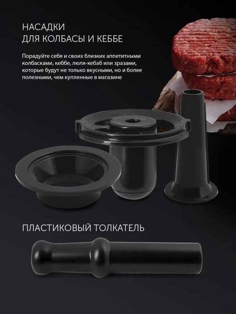 Многофункциональные стальные сменные насадки отличаются исключительной прочностью, устойчивостью к ржавчине и коррозии. Благодаря удобному механизму извлечения и установки, металлические насадки легко чистятся и заменяются. В набор входят: 1) Чаша (лоток) из высококачественного пластика. 2) Два круглых диска из нержавеющей стали диаметрами 5 мм и 7 мм, для переработки мяса любой плотности. 3) Насадки для приготовления колбас и кеббе. 4) Пластиковый толкатель.