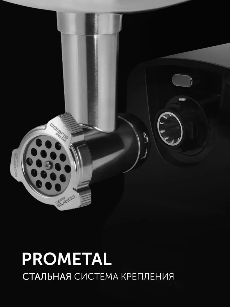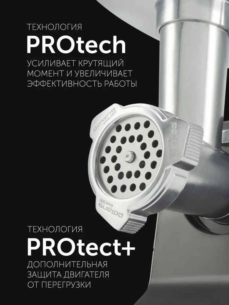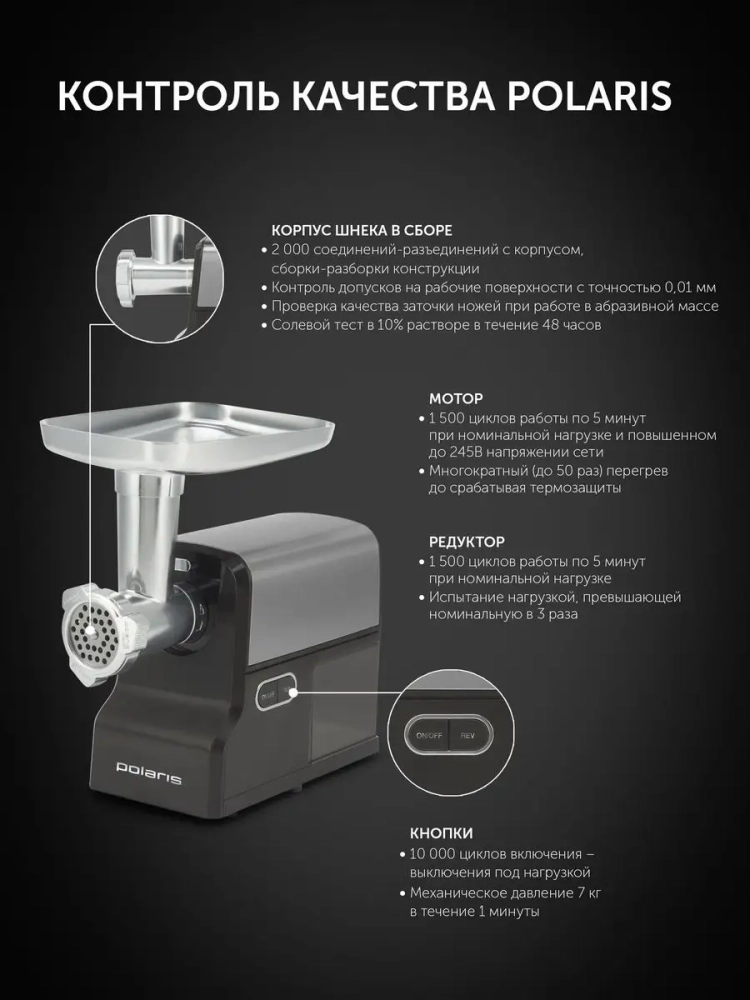 Мясорубка электрическая Polaris PMG 2585A RUS оснащена мощным мотором 2500 Вт и дополнительной защитой от перегрева PROtect+. Она автоматически отключит прибор при перегреве, предотвращая поломку и продлевая срок его службы. С технологией PROTech способна перерабатывать до 2,8 кг в минуту, функция усиливает крутящий момент и увеличивает эффективность работы. Электромясорубка выделяется многофункциональностью, стальной системой креплений ProMetal и расширенной комплектацией. В комплекте: 3 диска для фарша из нержавеющей стали 3, 5 и 7 мм, насадки для приготовления колбас и кеббе, шнековая соковыжималка и овощерезка с 4 барабанами (для крупной и мелкой терки, шинковки и драников). Кроме того, конструкция электромясорубки предусматривает съемный пластиковый лоток для фарша и хранения аксессуаров. Мясорубка электрическая с насадками и с соковыжималкой проста в эксплуатации, надежна и устойчива благодаря прорезиненным ножкам. Наличие функции реверса помогает быстро, не разбирая рабочий блок, удалить застрявшие кусочки мяса и жилы. Срок гарантийного обслуживания мясорубки Polaris – 2 года.