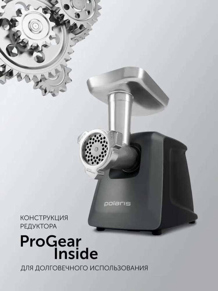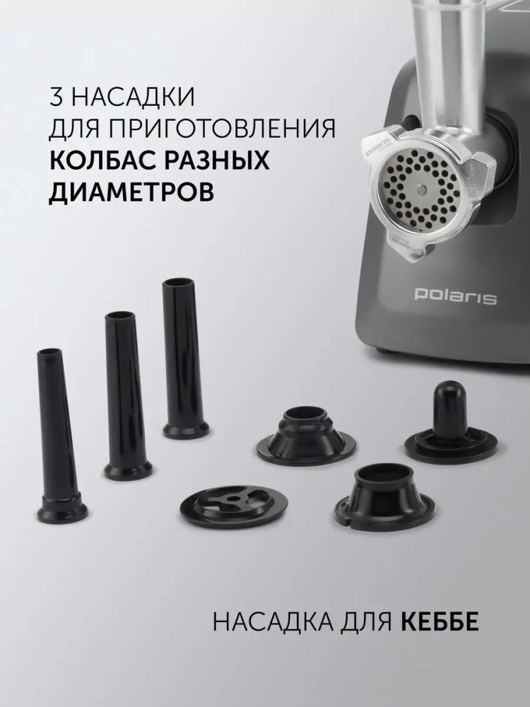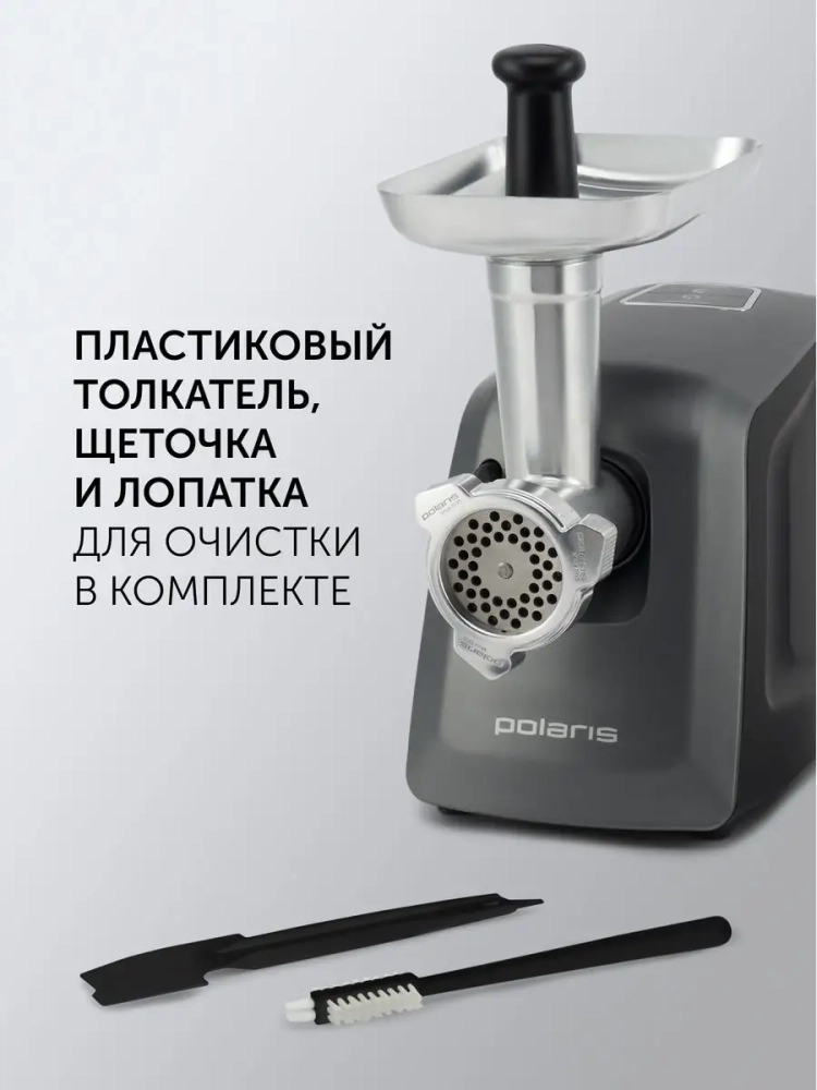 Мясорубка электрическая с овещерезкой Polaris PMG 3090 RUS облегчит и ускорит процесс приготовления разнообразных блюд. Оснащена надежным мотором мощностью 3000 Вт, что обеспечивает высокую производительность прибора: до 3,5 кг мяса в минуту. Подходит для приготовления домашних колбас, кеббе, салатов и овощных закусок. Функция реверс помогает быстро, не разбирая мясорубку, прочистить ее от застрявших кусочков мяса и жил. Управление осуществляется двумя кнопками, удобно расположенными сверху на корпусе. Для надежной работы измельчающего блока реализована стальная система креплений Prometal и конструкция редуктора ProGear Inside с износостойкой металлической шестерней. За защиту двигателя от перегрузок отвечает технология PROtect+. Она автоматически отключит прибор при перегреве, предотвращая поломку и продлевая срок его службы. Загрузочный лоток и толкатель гарантируют безопасное добавление продуктов в шнек электромясорубки. Электрическая мясорубка Polaris включает расширенный набор насадок. В комплекте идут 3 решетки для перекручивания фарша из нержавеющей стали с диаметром отверстий 3, 5 и 7 мм, 3 насадки для колбасок, одна для кеббе и овощерезка с 4 барабанами (мелкая и крупная терки, шинковка и терка для драников). Для удобства очистки предусмотрен специальный аксессуар для удаления остатков фарша из решетки, щеточка и лопатка. Мясорубка с насадками электрическая обладает стильным дизайном и высокой функциональностью, не занимает много места на столешнице и фиксируется с помощью нескользящих ножек. Гарантия на мясорубку Polaris 3 года.