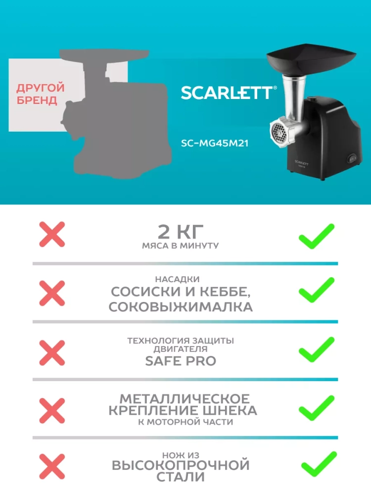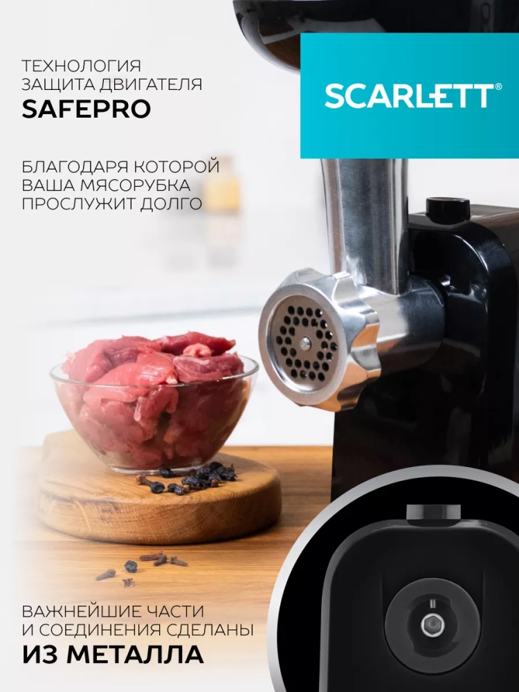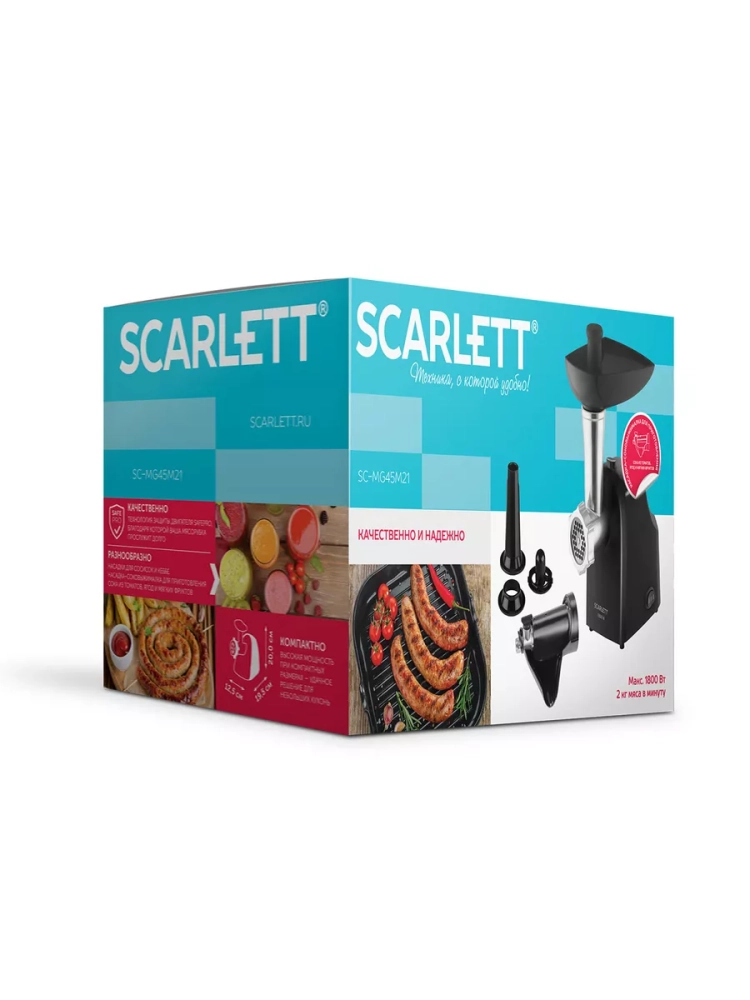 Электромясорубка Scarlett SC-MG45M21 идеально подходит для приготовления привычных блюд и гастрономических изысков. Компактный прибор способен справиться с жёстким и даже жилистым мясом. Высокая мощность 1800 Вт позволяет за минуту произвести 2 кг фарша. В комплект входят решетка с отверстиями 5 мм, насадки для приготовления домашних колбас и кеббе, а также насадка-соковыжималка. Если устройство забилось и прокручивать мясо стало затруднительно, просто включите режим реверса - шнек начнёт вращаться в обратном направлении. Одним нажатием кнопки вы легко очистите машину от застрявших кусочков. Благодаря небольшим размерам для прибора легко найти место в кухонном шкафу. Профессиональная электромясорубка