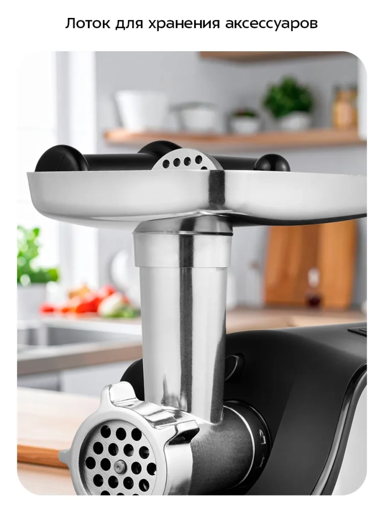 Электрическая мясорубка Kitfort — это не только мощный инструмент для приготовления мяса, но и стильный элемент вашей кухни. Серебристый цвет корпуса придаст вашей кухне современный вид. Электромясорубка оснащена контейнером для хранения насадок, что делает ее использование еще более удобным.
