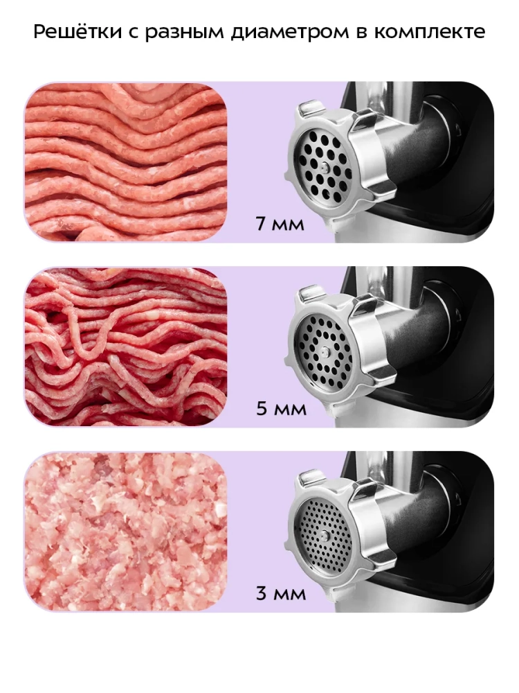 Электромясорубка Kitfort предлагает разнообразие функций благодаря комплекту насадок. В комплект входят насадки для приготовления колбасы, что позволяет создавать домашние колбасы с легкостью. Электрическая мясорубка также оснащена металлической решеткой, обеспечивающей равномерную рубку мяса.