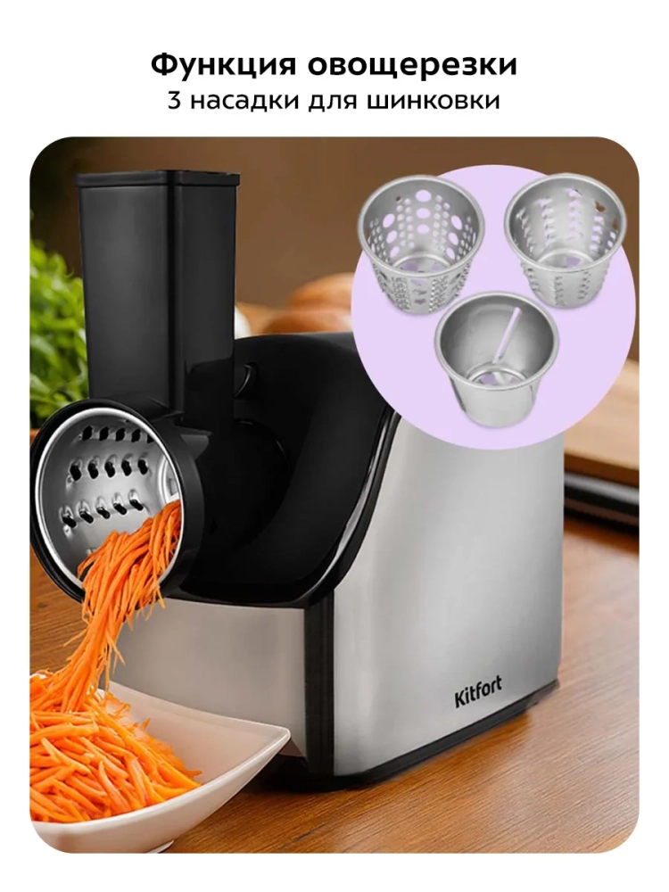 Электромясорубка Kitfort также оснащена функцией овощерезки, что позволяет использовать ее как универсальное средство для приготовления различных блюд. Овощерезка и терка помогут быстро нарезать овощи для салатов и гарниров. Ручная работа на кухне теперь станет проще благодаря этой электрической технике.