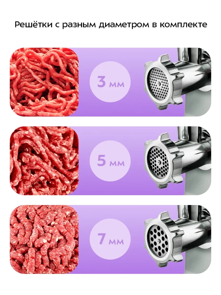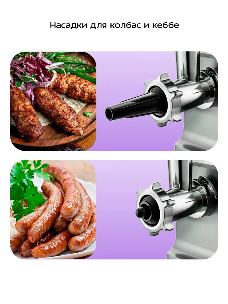 Мясорубка комплектуется различными насадками, включая насадку для колбас, что расширяет функциональные возможности устройства. В комплект также входят ножи и решетка из нержавеющей стали, обеспечивающие долговечность и надежность в работе. Шнек и лоток для мяса выполнены из высококачественных материалов, что гарантирует долгий срок службы техники.