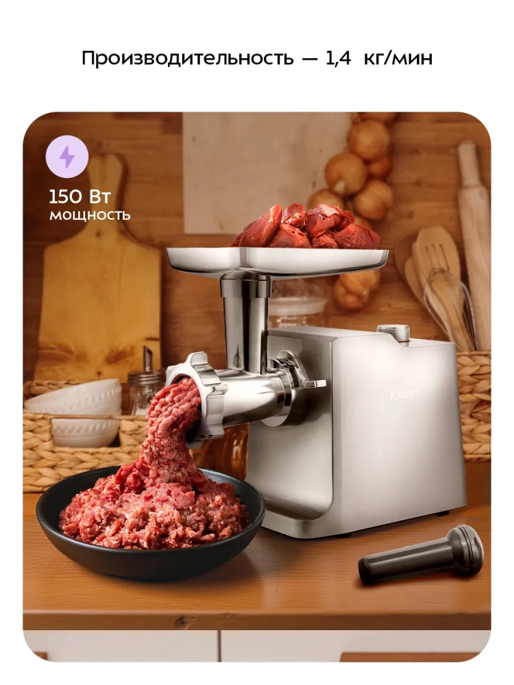 Электрические мясорубки Kitfort — это надежные девайсы для вашей кухни, которые помогут вам в приготовлении разнообразных блюд. Мясорубка с насадками для колбас станет незаменимым помощником в создании кулинарных шедевров. Выбирая эту модель, вы получаете качественное средство для переработки мяса и приготовления домашних колбас.