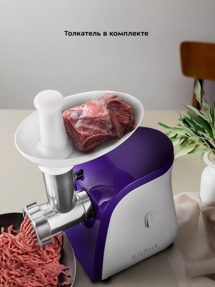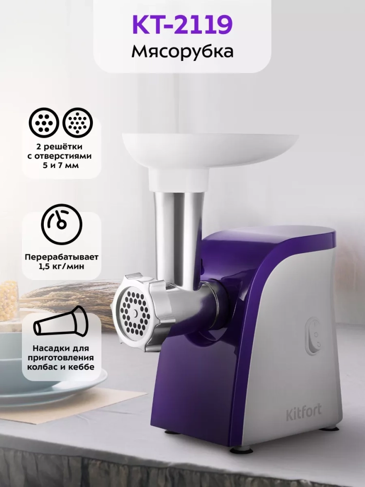 Мясорубка Kitfort KT-2119 предназначена для измельчения сырого и вареного мяса, приготовления колбас и кеббе. Корпус устройства выполнен из пластика, а режущие детали — из металла, что позволяет мясорубке с легкостью справляться с мясом разной жесткости.