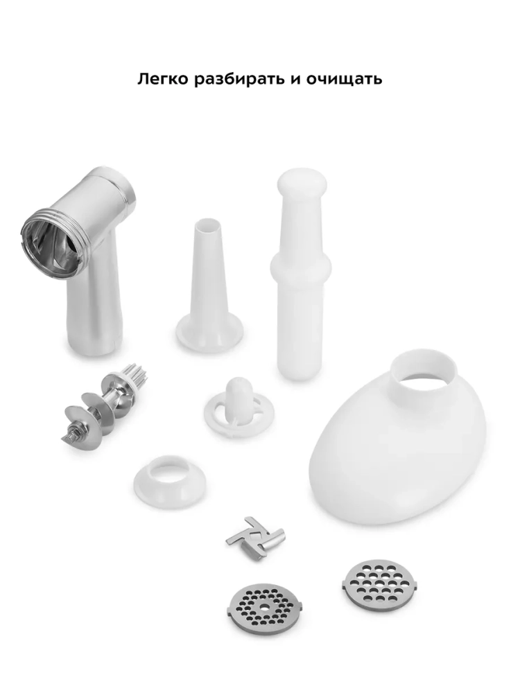 Данная модель компактна и удобна в использовании, так как ее легко собирать и мыть. Прорезиненные ножки с присосками делают устройство более устойчивым на столе. Благодаря стильному дизайну мясорубка впишется в любой интерьер.