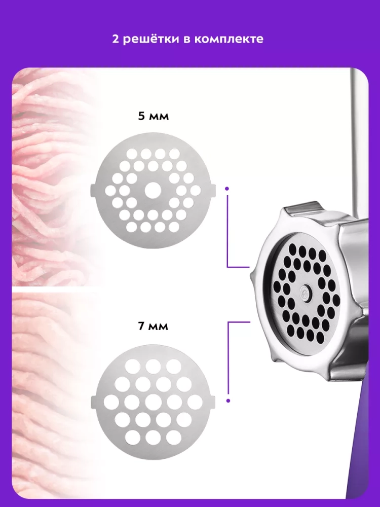 Мясорубка имеет одну скорость работы и функцию реверса. В комплект мясорубки входят две решетки для изготовления фарша с отверстиями 5 мм и 7 мм, а также насадки для приготовления колбас и кеббе.