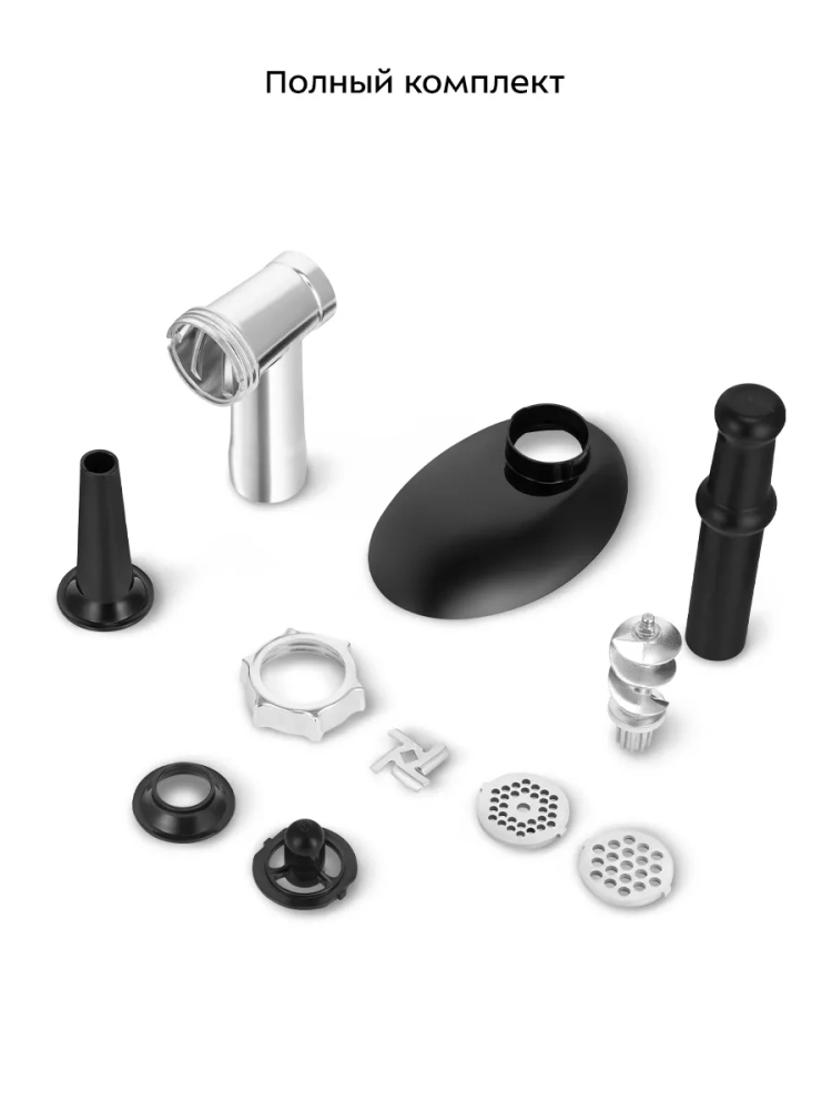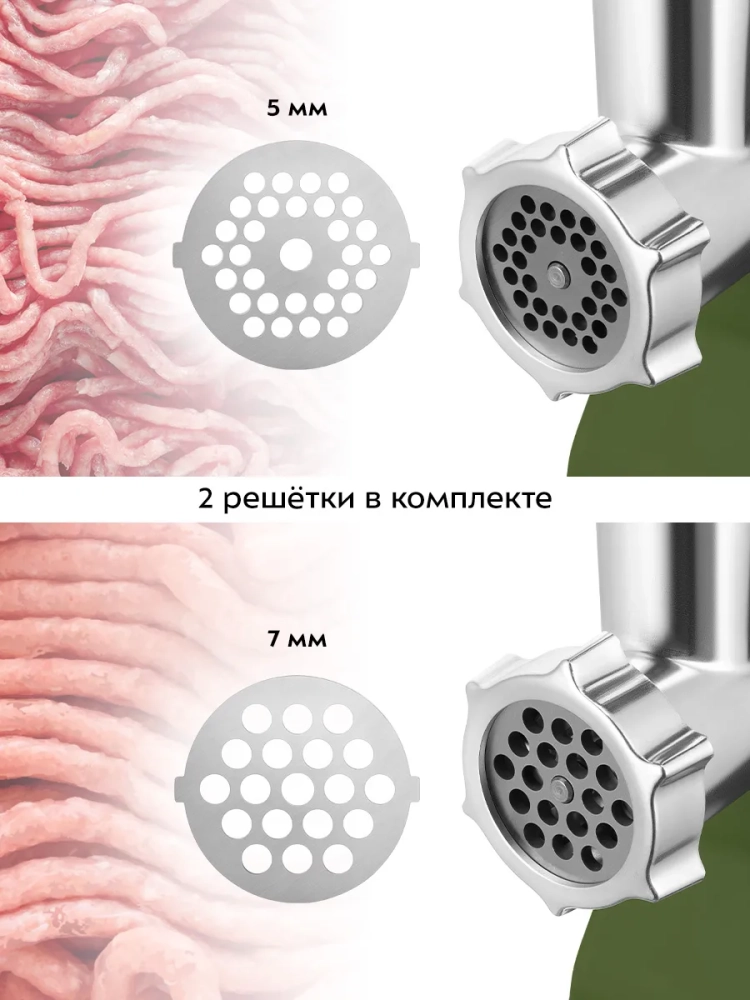 Мясорубка имеет одну скорость работы и функцию реверса. В комплект мясорубки входят две решетки для изготовления фарша с отверстиями 5 мм и 7 мм, а также насадки для приготовления колбас и кеббе.