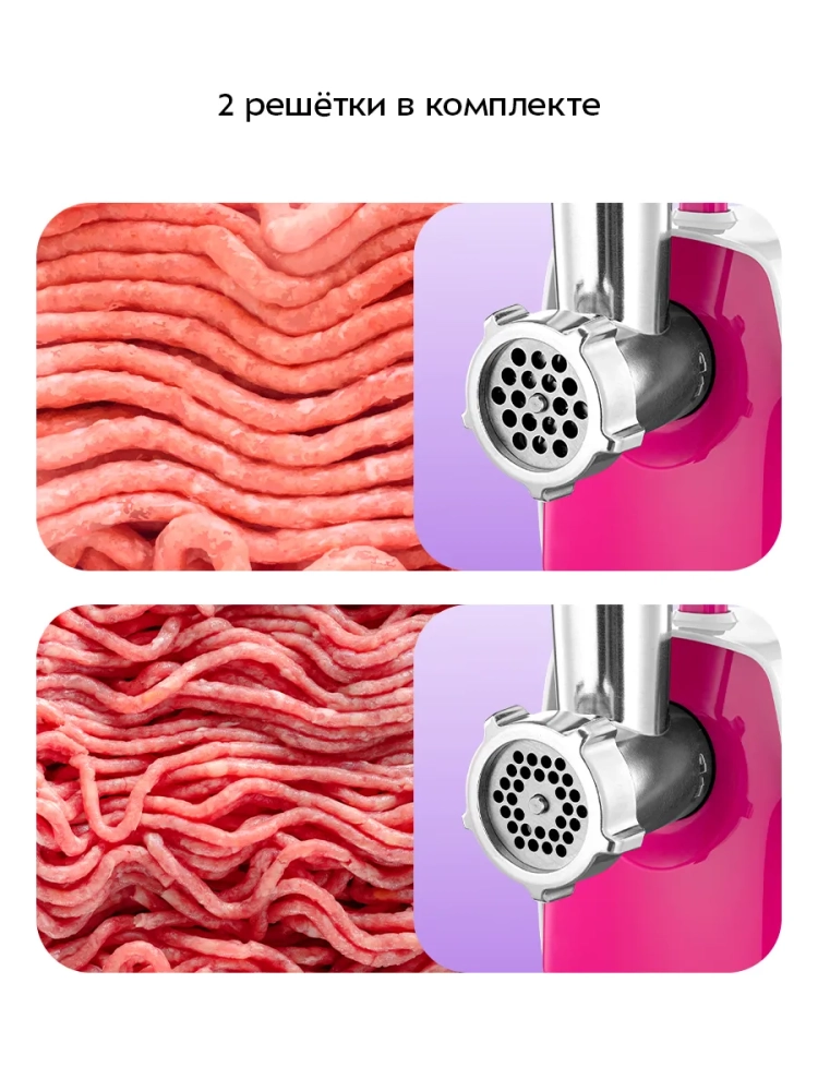 Мясорубка имеет одну скорость работы и функцию реверса. В комплект мясорубки входят две решетки для изготовления фарша с отверстиями 5 мм и 7 мм, а также насадки для приготовления колбас и кеббе.