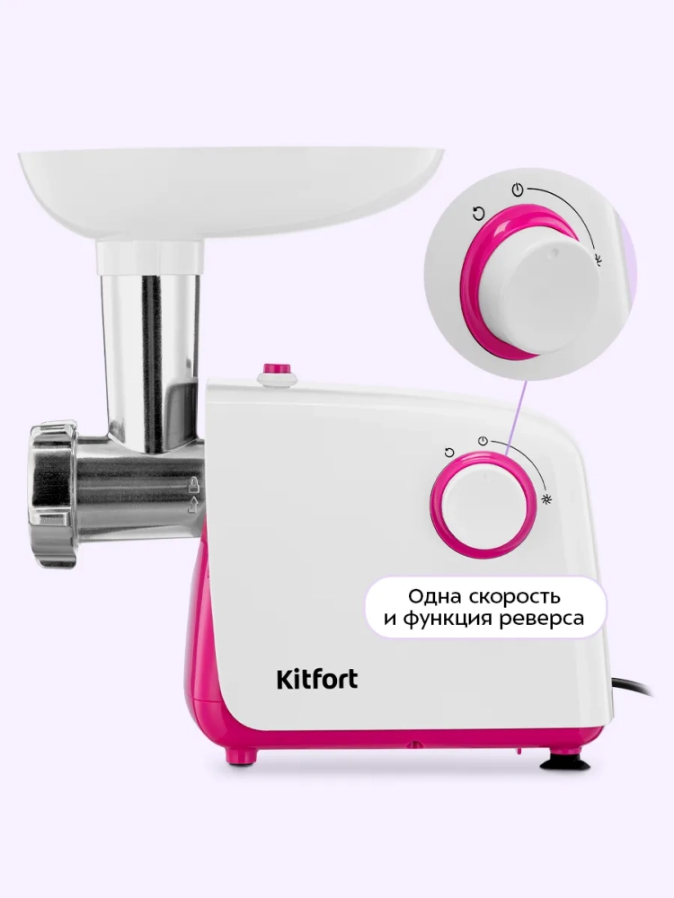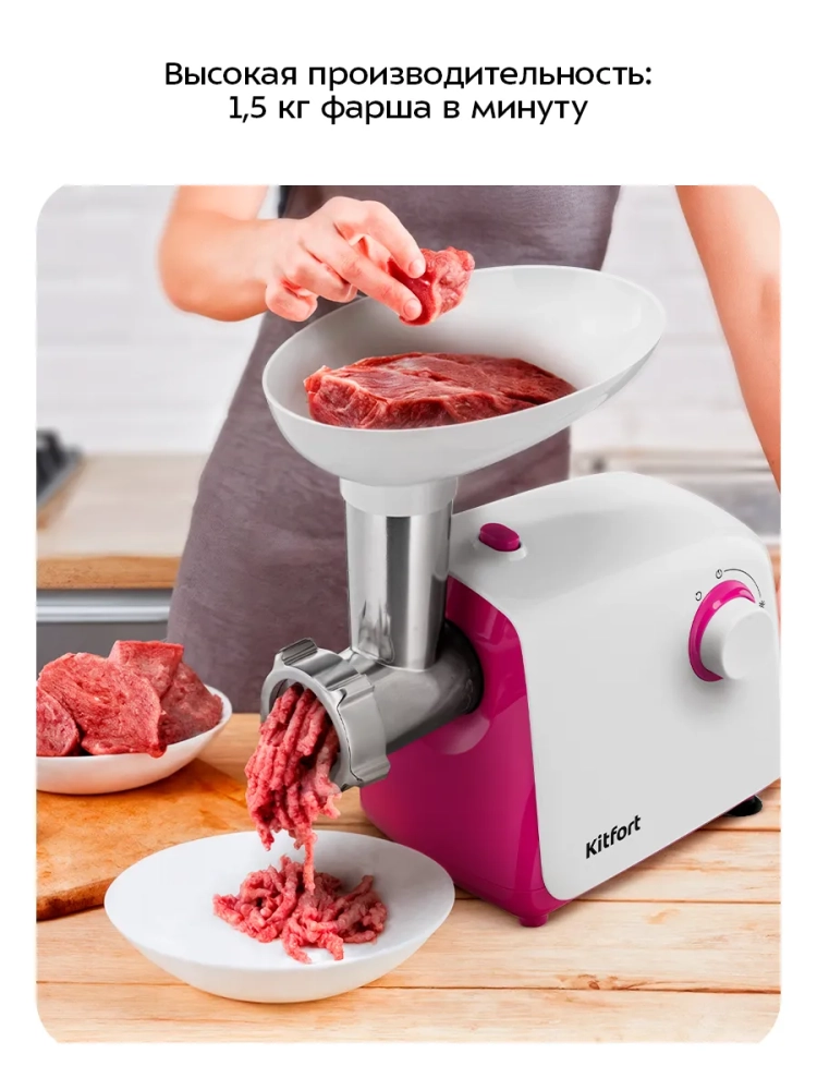 Мясорубка Kitfort KT-2132 предназначена для измельчения сырого и вареного мяса, приготовления колбас и кеббе. Корпус устройства выполнен из пластика, а режущие детали — из металла, что позволяет мясорубке с легкостью справляться с мясом разной жесткости.