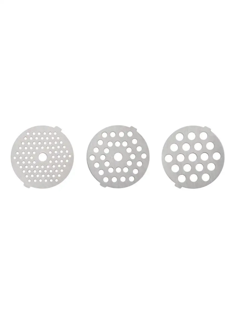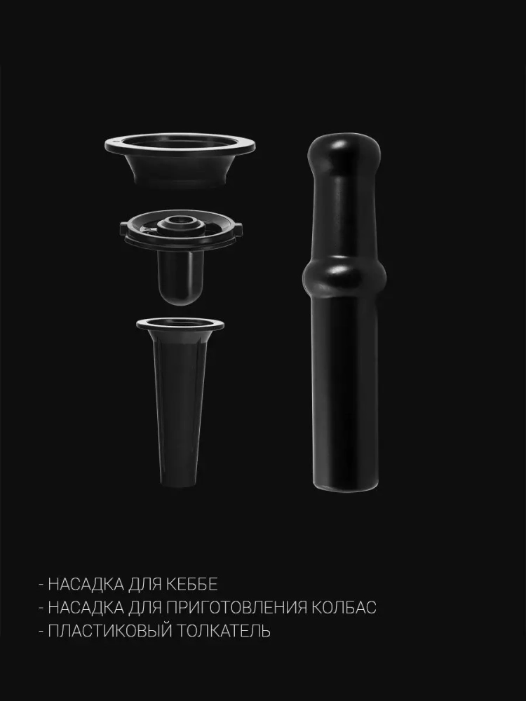 В наборе представлены различные сменные насадки: Три круглых диска из нержавеющей стали (3 мм, 5 мм и 7 мм) для приготовления фарша. Насадки для изготовления колбас и кеббе. Металлический лоток - чаша. Пластиковый пресс - толкатель.