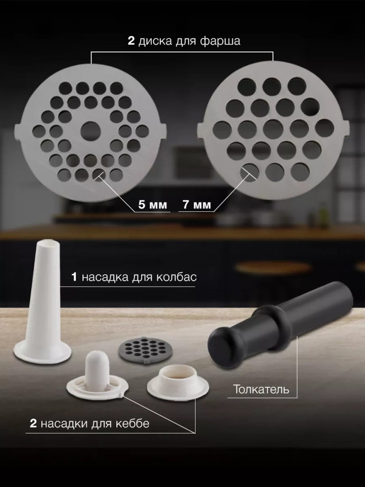 Диски для фарша с отверстиями диаметром 5 и 7 мм позволяют регулировать величину помола, что дает возможность готовить блюда с рубленым мясом.