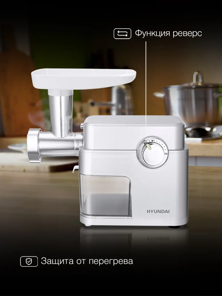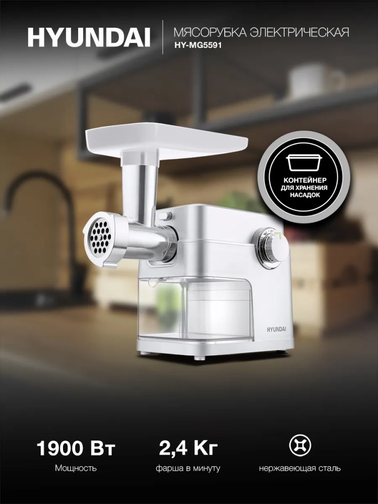 Мясорубка Hyundai HY-MG5591 серебристый/черный, мощность 1900Вт, материал лотка пластик, длина кабеля питания 1м, диски с отверстиями диаметром 3 мм, 5 мм и 7 мм