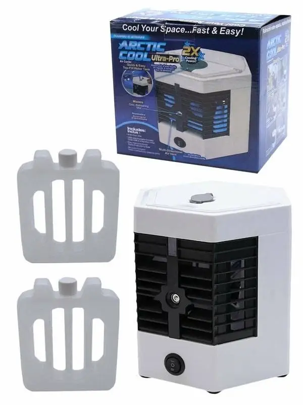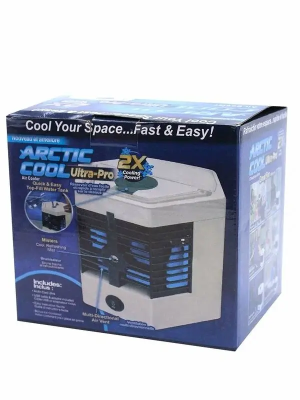 Arctic Air Ultra-pro - это компактный персональный охладитель наполняющий воздух вокруг вас приятной прохладой всего за несколько минут. Он обладает легким весом и бесшумным вентилятором, который имеет 2 режима и 3 эффекта, охлаждение, очищение и увлажнение воздуха. Устройство быстро создает приятный микроклимат рядом с пользователем. С его помощью вы сможете наслаждаться прохладой где угодно: на кухне, в кабинете, в гостиной. Устройство абсолютно бесшумно и его можно взять с собой на работу. Arctic Air Ultra охлаждает, очищает и увлажняет воздух Он выполнен в привлекательном дизайне и способен вписаться в любой интерьер. Простое использование, просто вставьте замороженную воду (Важно: Камеру для жидкости не заливайте водой до краев перед заморозкой) в камеру и налейте воду в резервуар.
