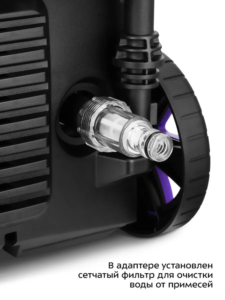 Прибор можно подключать к источнику водоснабжения с напорным давлением (например, к садовому водопроводу) или без напорного давления (бочкам, ведрам и т.д.), так как мойка оборудована самовсасывающим насосом. Для подключения устройства к источнику водоснабжения рекомендуется использовать армированный подающий шланг длиной от 2 до 5 метров и быстросъемный коннектор или хомут (подающий шланг, быстросъемный коннектор и хомут в комплект не входят и приобретаются отдельно).