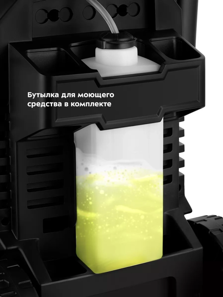 Кроме того, в комплекте идет роторная насадка, которая обеспечивает повышенный напор воды и удаляет наиболее стойкие загрязнения. Благодаря бутылке для моющего средства можно удобно нанести моющее средство на очищаемую поверхность.