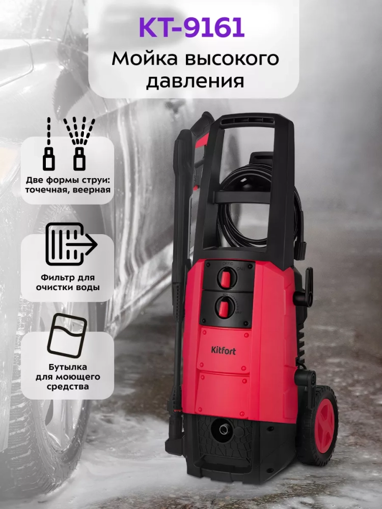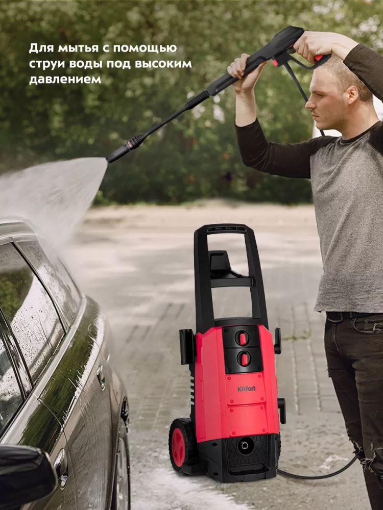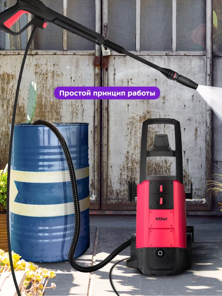 Мойка высокого давления Kitfort KT-9161 предназначена для мытья автомобилей, садовых принадлежностей, фасадов, террас, плитки, кирпичной кладки и иных влагостойких поверхностей с помощью струи воды под высоким давлением.