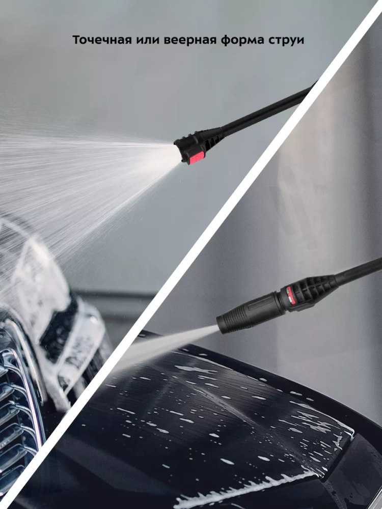 К прибору с помощью соединительной насадки крепится насадка с регулируемым соплом, которая позволяет выбрать точечную или веерную форму струи. Точечная струя используется для очистки стойких локальных загрязнений. Веерная струя оптимальна для обработки крупных поверхностей.