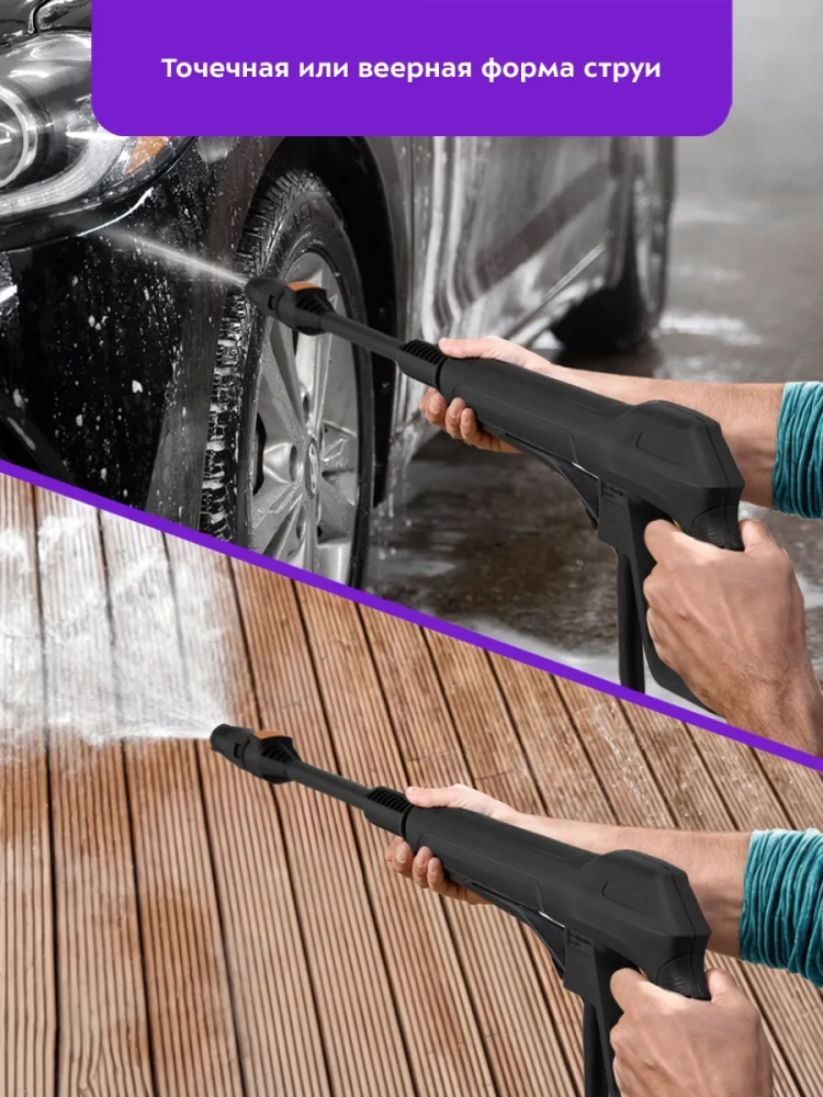 К прибору с помощью соединительной насадки крепится насадка с регулируемым соплом, которая позволяет выбрать точечную или веерную форму струи. Точечная струя используется для очистки стойких локальных загрязнений. Веерная струя оптимальна для обработки крупных поверхностей.