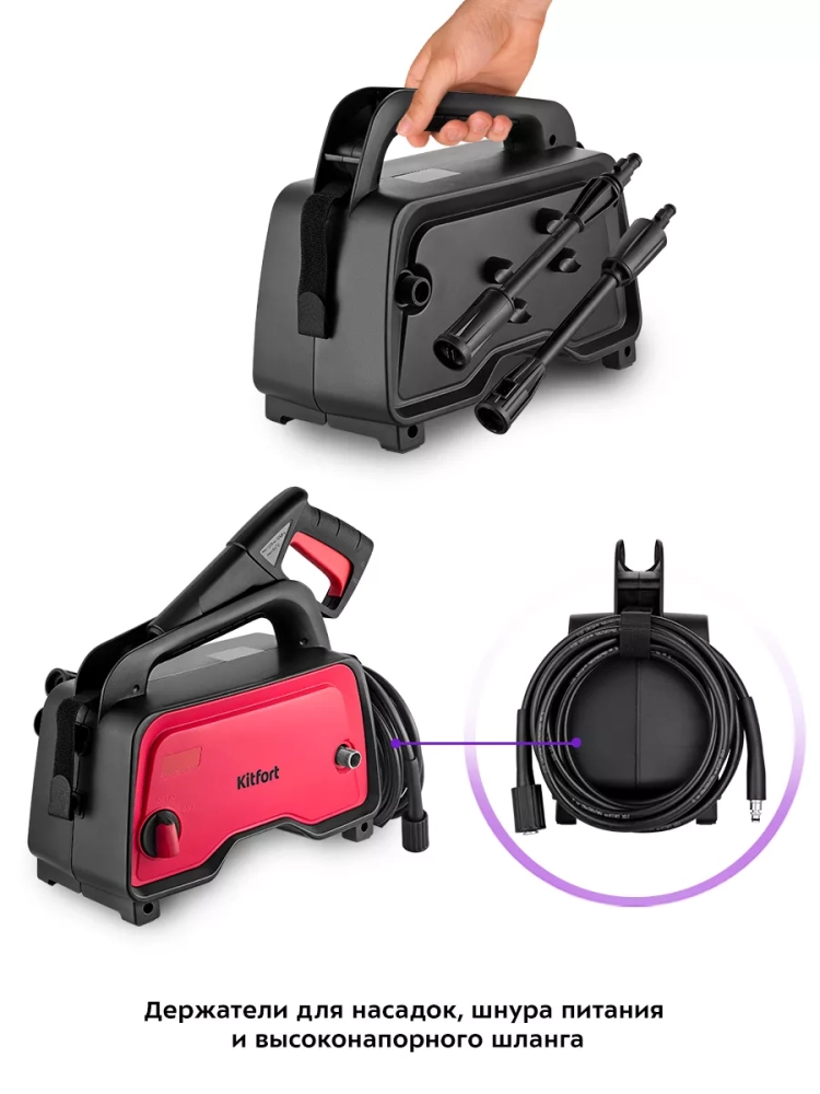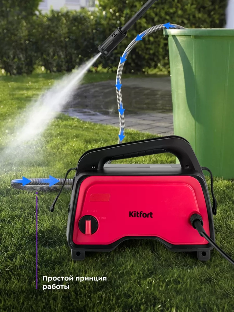Мойка высокого давления Kitfort KT-9163 предназначена для мытья автомобилей, садовых принадлежностей, фасадов, террас, плитки, кирпичной кладки и иных влагостойких поверхностей с помощью струи воды под высоким давлением. Благодаря небольшому весу и компактности устройство удобно при транспортировке и хранении.