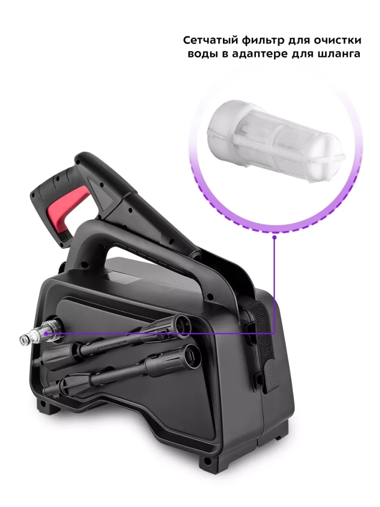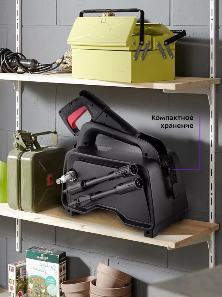 Для удобства хранения на корпусе есть держатели для насадок, а также крепления для шнура питания и высоконапорного шланга. На корпусе есть ручка для переноски прибора, на ней также можно расположить моющий пистолет при хранении или в перерывах в работе.