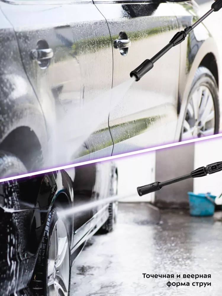 К прибору с помощью соединительной насадки крепится насадка с регулируемым соплом, которая позволяет выбрать точечную или веерную форму струи. Точечная струя используется для очистки стойких локальных загрязнений. Веерная струя оптимальна для обработки крупных поверхностей.