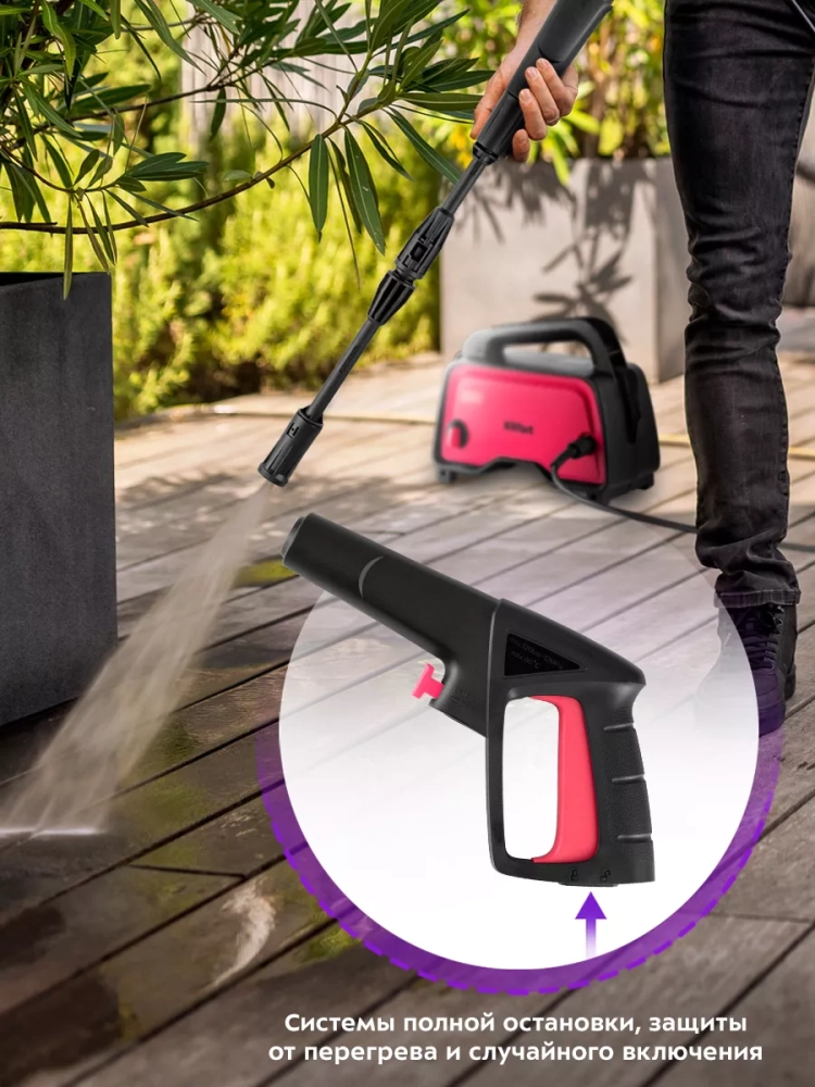 Устройство оснащено защитой от перегрева. Также у прибора есть система полной остановки, которая выключает двигатель при отпускании кнопки подачи воды, что экономит энергию и увеличивает ресурс помпы. Кнопка подачи воды оснащена блокиратором, чтобы предотвратить случайное включение подачи воды.