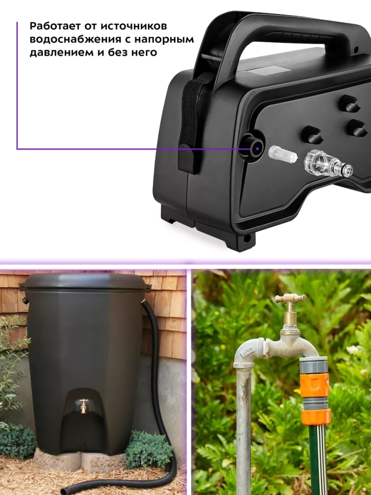 Прибор можно подключать к источнику водоснабжения с напорным давлением (например, к садовому водопроводу) или без напорного давления (дождевым бочкам, ведрам и т.д.), так как мойка оборудована самовсасывающим насосом. Для подключения устройства к источнику водоснабжения рекомендуется использовать армированный шланг с внутренним диаметром около 15 мм и длиной от 2 до 5 метров (в комплект не входит).
