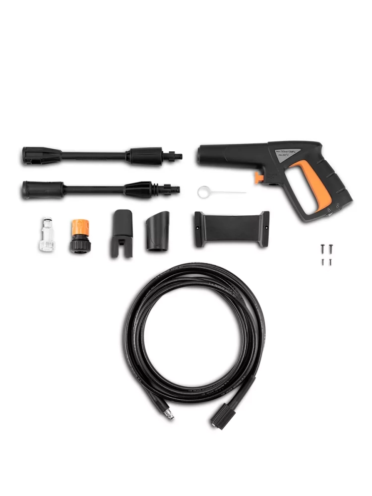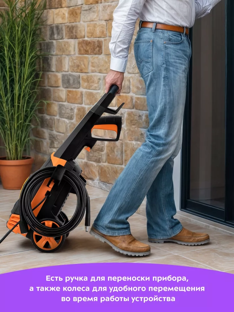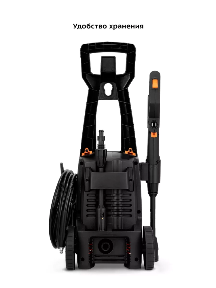 Для удобства хранения на корпусе есть держатели насадок, моющего пистолета и высоконапорного шланга. На корпусе есть ручка для переноски прибора, а также колеса для удобного перемещения во время работы устройства.