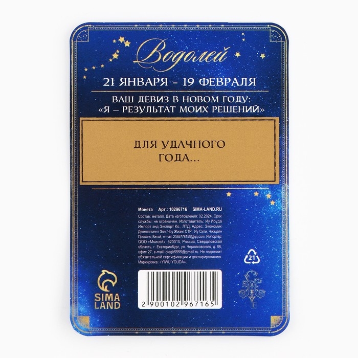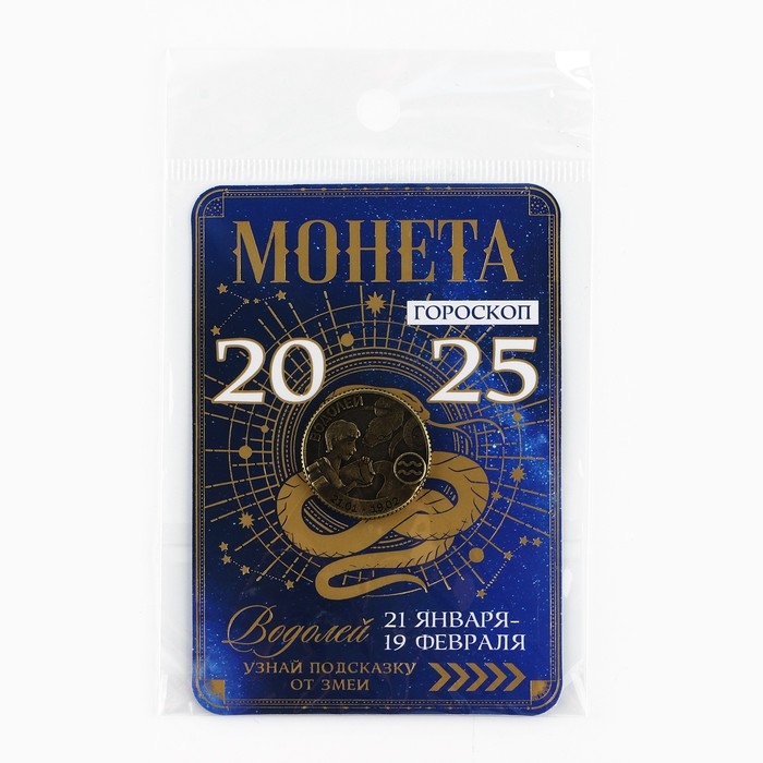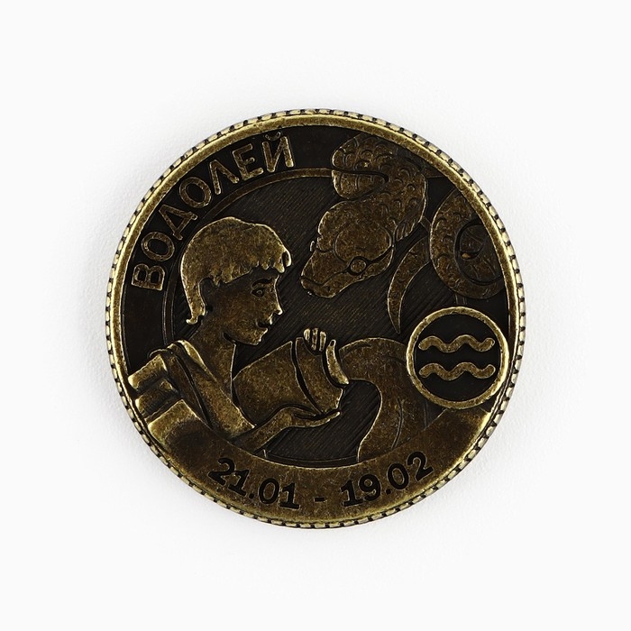 Монета гороскоп 2025 новогодняя «Водолей» на Новый год, латунь, диам. 2, 5 см