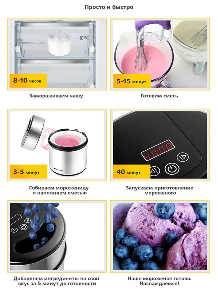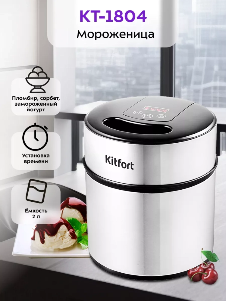 Полуавтоматическая мороженица Kitfort КТ-1804 поможет приготовить вам настоящее мороженое из натуральных продуктов, а также сорбет, джелато и замороженный йогурт. Мороженица имеет стильный металлический корпус, снабжена системой смешивания и имеет чашу заполненную хладагентом для охлаждения мороженого во время приготовления. Принцип работы мороженицы основан на предварительной заморозке чаши с хладагентом и затем добавлением туда заранее приготовленной и охлажденной смеси для приготовления мороженого. После запуска двигателя с подсоединенной смешивающей лопастью и заливке туда смеси, происходит замешивание и одновременное замерзание смеси на стенках чаши. Смешивающая лопасть при совершении вращения, одной стороной намазывает жидкую смесь на стенки чаши для замораживания, а другой стороной, при следующем полуобороте, соскребает намерзшую смесь. Таким образом, происходит создание «снежной» структуры мороженого. Вы можете употреблять мороженое сразу после приготовления, когда оно имеет кремовую структуру, или продолжить заморозку, поместив приготовленное мороженое в морозилку на несколько часов.