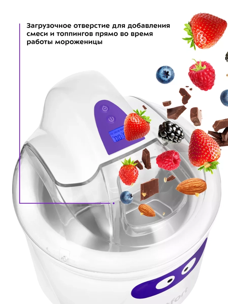 Крышка мороженицы изготовлена из прозрачного пластика, благодаря чему можно наблюдать за процессом приготовления мороженого. Для удобства добавления ингредиентов в процессе приготовления в крышке есть загрузочное отверстие. Прорезиненные ножки не дают устройству скользить по столу.