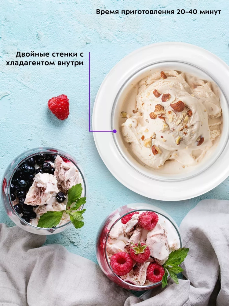Вы можете употреблять мороженое сразу после приготовления, когда оно имеет кремовую текстуру, или продолжить заморозку, поместив приготовленное мороженое в морозильную камеру на несколько часов.