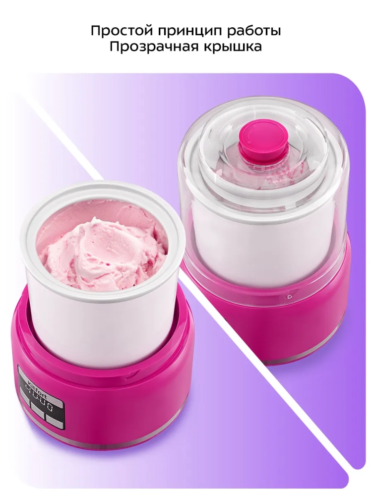 Крышка мороженицы изготовлена из прозрачного пластика, благодаря чему можно наблюдать за процессом приготовления. Для удобства добавления ингредиентов в процессе приготовления в крышке есть загрузочное отверстие, закрываемое колпачком. Прорезиненные ножки не дают устройству скользить по столу.