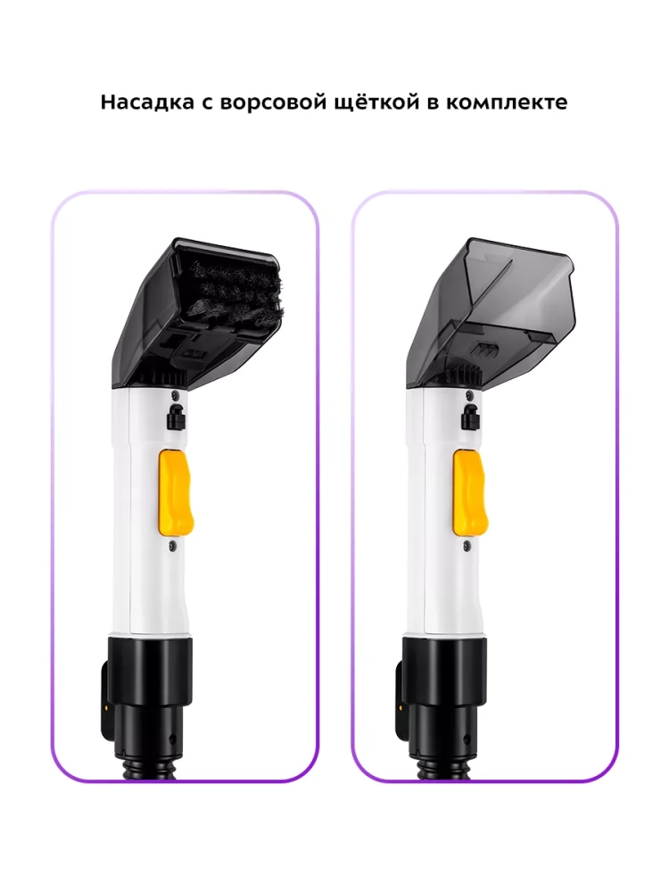 У пылесоса небольшой размер и вес, а также есть ручка, держась за которую можно с легкостью перемещать прибор. В комплекте есть 2 насадки. Насадка с ворсовой щеткой подходит для очистки въевшихся загрязнений. Насадка без ворсовой щетки удобна для очистки несильных загрязнений.