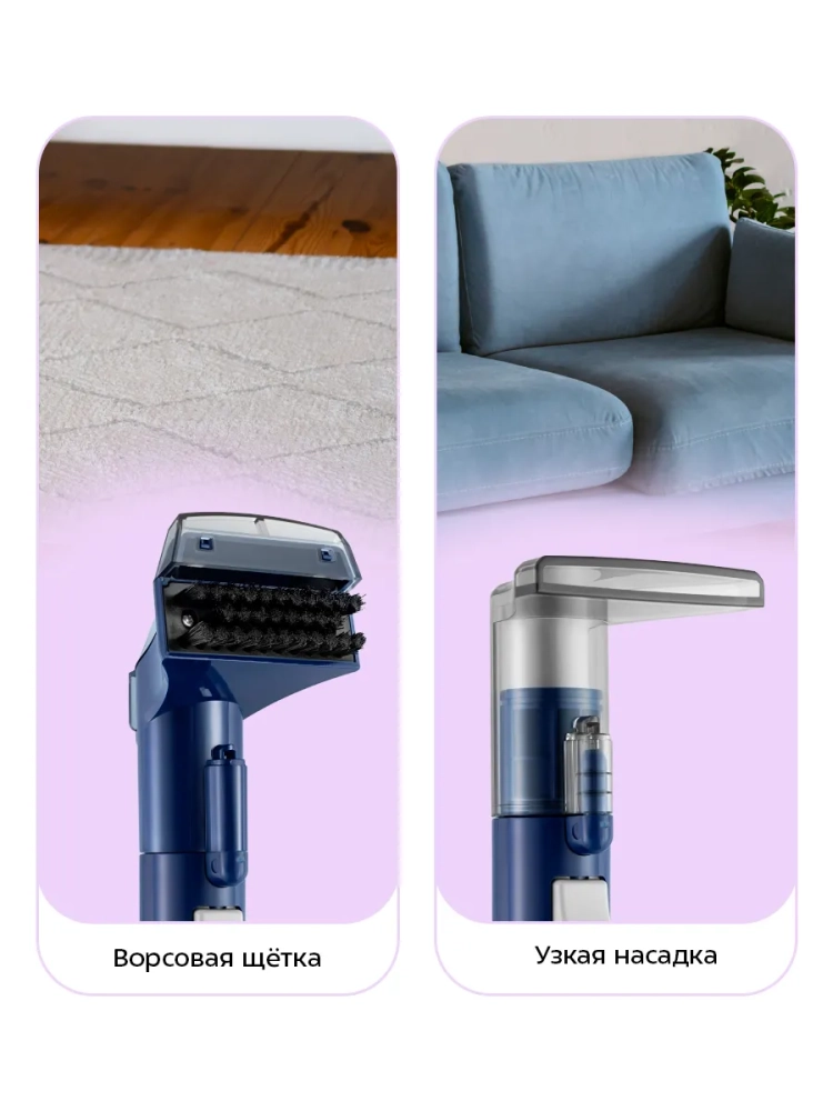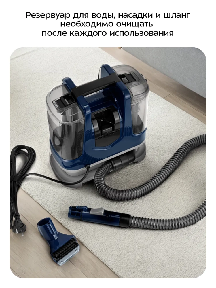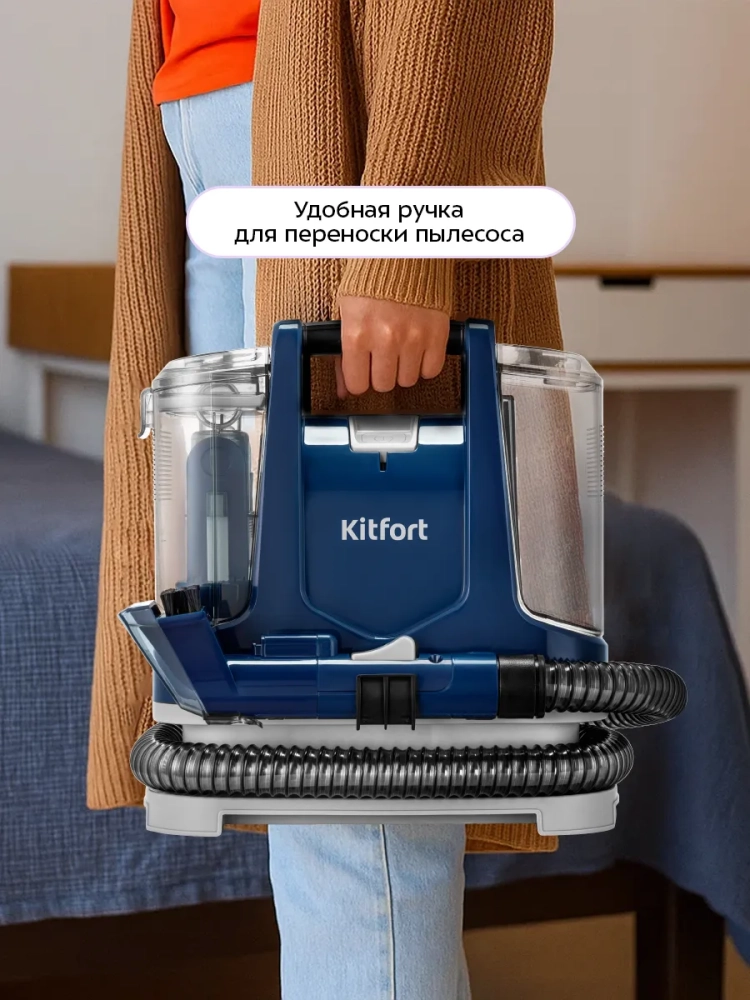Моющий пылесос для ковров и мягкой мебели Kitfort KT-5520 поможет очистить обивку дивана, кресел, сидений в машине и другой мягкой мебели, а также ковры и ковровые покрытия. В резервуар для чистой воды можно добавлять воду с разведенным в ней специальным чистящим средством, не образующим большое количество пены. При нажатии на кнопку подачи воды пылесос подает воду на очищаемую поверхность, а затем всасывает воду с пылью и другими загрязнениями. Пыль и грязь оседают в воде в резервуаре для грязной воды. Когда резервуар для грязной воды будет наполнен выше максимально допустимого уровня, поплавок в резервуаре поднимется и перекроет всасывающее отверстие, пылесос прекратит всасывать жидкость. Это защитит двигатель от попадания влаги. Отключите пылесос и вылейте грязную воду из резервуара. Пылесос удобно перемещать за ручку. В комплекте к бытовой технике идет ворсовая щетка и узкая насадка. Ворсовая щетка помогает собрать шерсть и волосы и подходит для очистки мягкой мебели и ковровых покрытий от въевшихся загрязнений в авто салоне. Узкую насадку удобно использовать для чистки щелей, углов и труднодоступных мест. Узкая насадка, крышка всасывающего отверстия ворсовой щетки и резервуар для грязной воды выполнены из прозрачного пластика, поэтому в процессе уборки хорошо видно, как много грязи собирает моющий пылесос. Чистить моющий пылесос очень легко, так как насадки и резервуары можно снять и промыть проточной водой. У моющего пылесоса есть держатель рукоятки шланга, поэтому прибор можно компактно складывать и удобно хранить. Моющий пылесос предназначен только для влажной уборки. Он не подходит для того, чтобы просто пропылесосить диван или ковер. Напряжение: ~220–240 В, 50/60 Гц. Мощность: 400 Вт. Класс защиты от поражения электрическим током: II. Емкость резервуара для чистой воды: 1,1 л. Емкость резервуара для грязной воды: 0,5 л. Длина шланга: 1,1 м. Длина шнура: 2,9 м. Размер устройства: 293 х 152 x 308 мм.