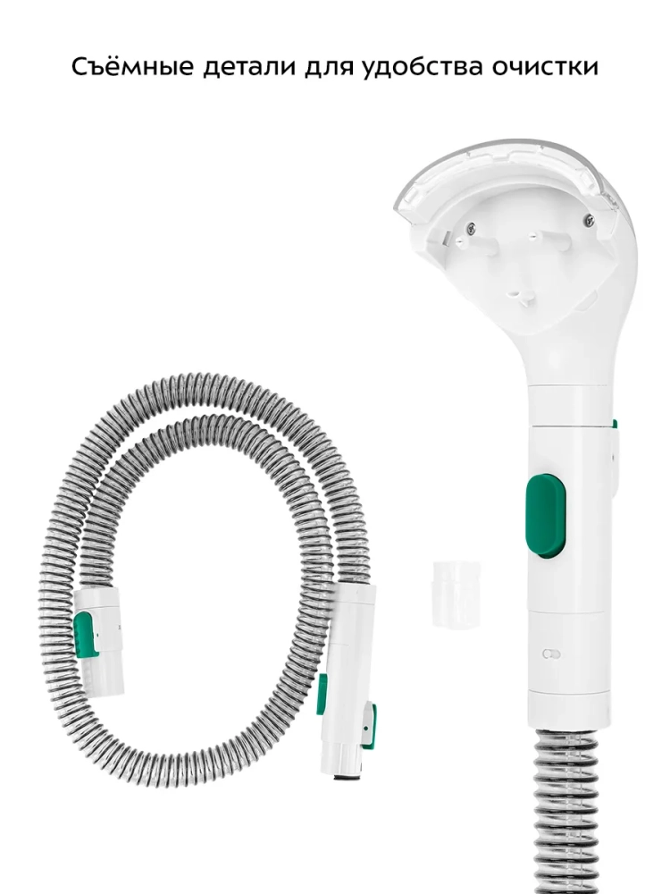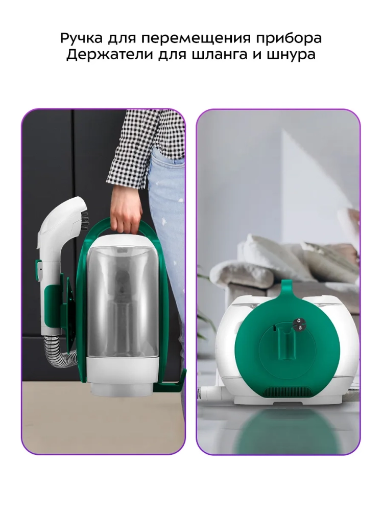 У моющего пылесоса есть крючок для шланга и держатель насадки, поэтому его можно компактно сложить и удобно хранить.