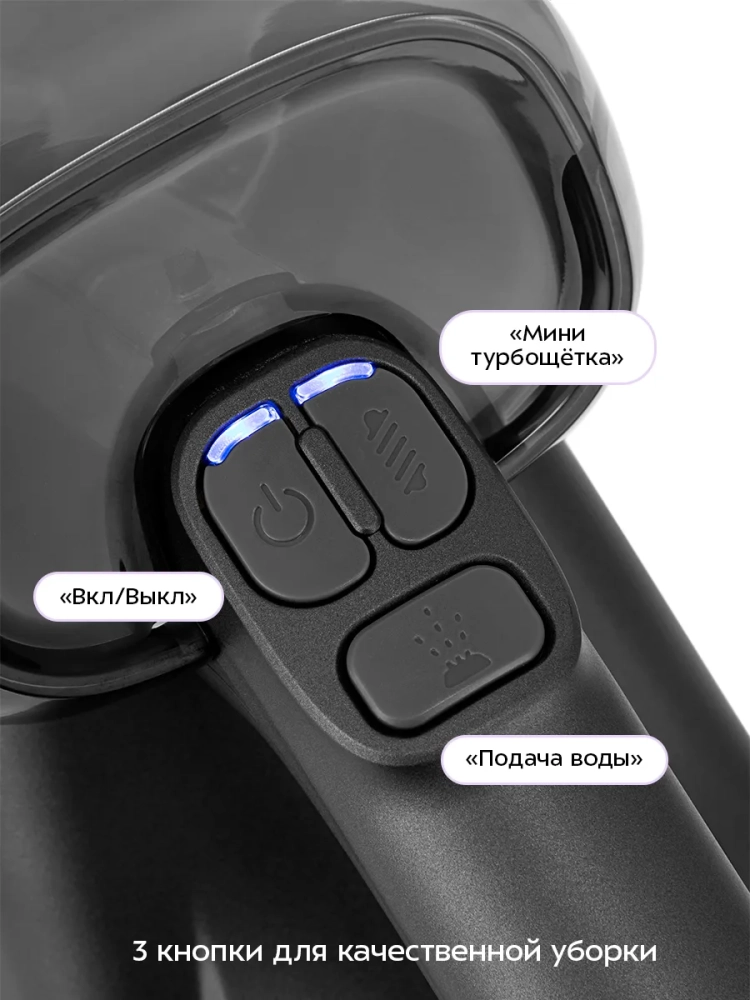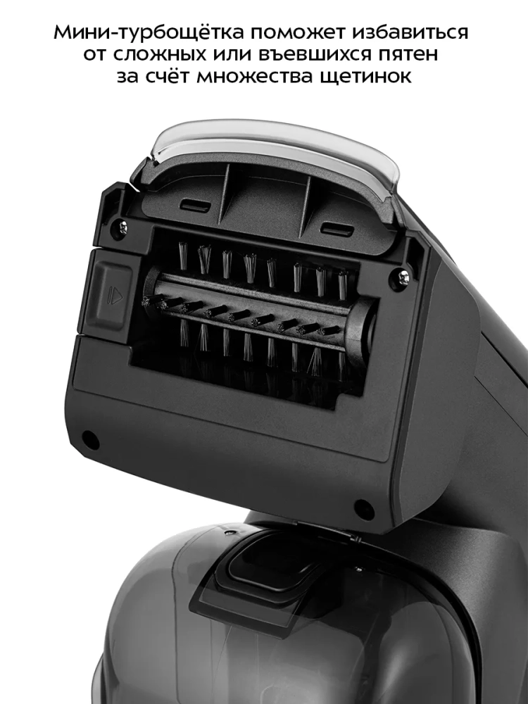 Пылесос удобно держать и перемещать за ручку во время уборки. В комплекте предусмотрены мини-турбощетка и насадка на шланг. Они хорошо подходят для очистки мягкой мебели и ковровых покрытий от въевшихся загрязнений. Моющий пылесос нельзя наклонять вбок или переворачивать во время уборки, поэтому с мини-турбощеткой можно проводить уборку только горизонтальных поверхностей. Насадка и шланг позволяют убирать вертикальные или наклонные поверхности, например, спинку дивана или кресла. Также во время уборки с насадкой и шлангом вы можете не держать пылесос, а положить его рядом с зоной уборки, предварительно распылив воду на зону уборки. Так ваши руки не будут уставать. Крышка всасывающего отверстия мини-турбощетки, насадка и резервуар для грязной воды выполнены из прозрачного пластика, поэтому в процессе уборки хорошо видно, как моющий пылесос всасывает грязную воду.