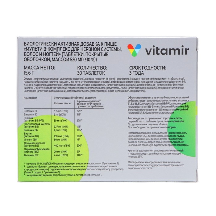 Мульти B-комплекс Витамир для нервной системы, волос и ногтей, 30 таблеток