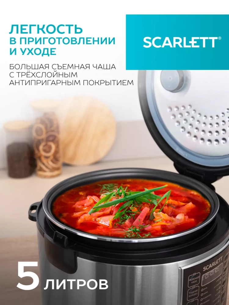 Вместительная мультиварка Scarlett SC-MC410S27 поможет приготовить любое блюдо при нужной температуре. Вам даже не придётся контролировать процесс: благодаря автоматическим программам прибор всё сделает за вас. В устройстве есть 20 автоматических режимов и 2 режима для управления, благодаря которым оно сделает молочную кашу, суп и выпечку быстрее, чем на обычной плите. С функцией подогрева вы сможете разогреть остывшие продукты или детское питание, а программа Йогурт обеспечит полезный завтрак. Чаша с 3-х слойным антипригарным покрытием объёмом 5 л позволит накормить даже большую семью и угостить вкусным ужином нежданно нагрянувших гостей. За счёт антипригарного покрытия пища не прилипает к посуде, а ёмкость легко очищается мягкими моющими средствами. Вы можете отложить старт прибора до 24 часов, если решили организовать обед к определённому времени и вручную изменить настройки на разных этапах приготовления блюда.