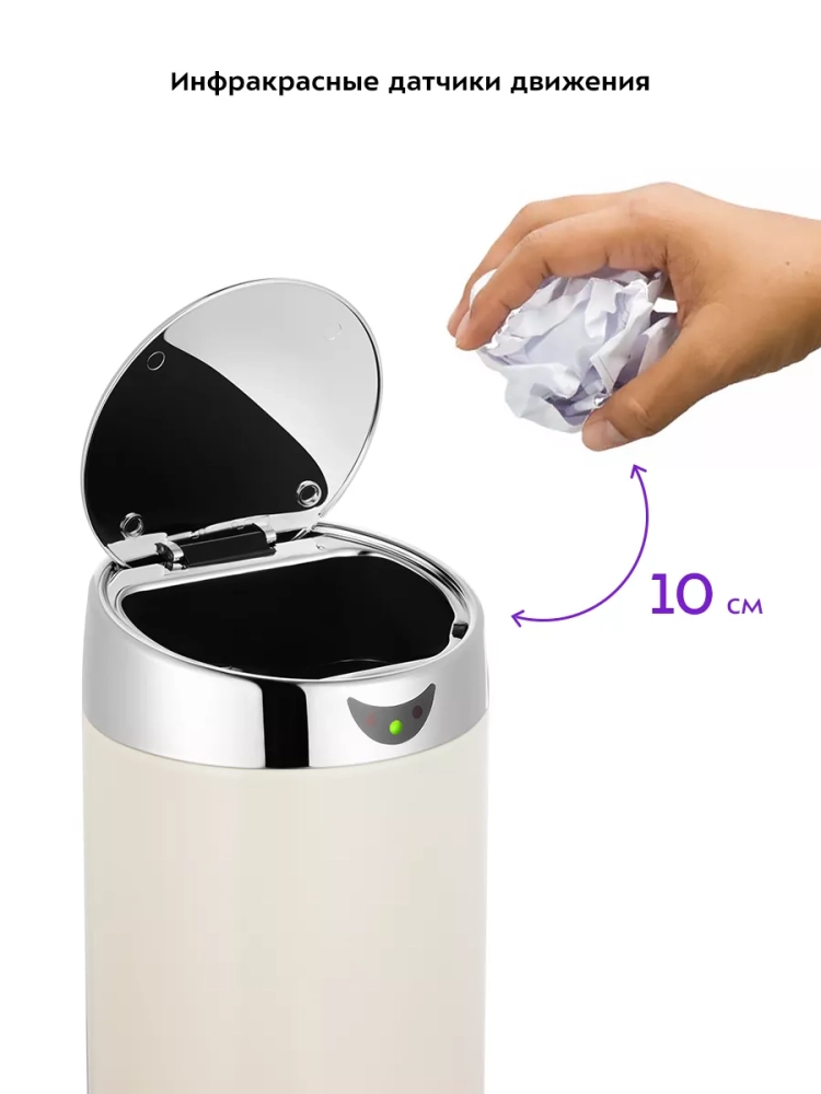 Сенсорное мусорное ведро оснащено инфракрасными датчиками. Такое ведро открывается и закрывается автоматически и его не нужно касаться при выбрасывании мусора. Датчики ведра КТ-6018 расположены на крышке. Когда объект появляется в зоне действия датчиков — откидная крышка ведра автоматически открывается и закрывается через 5 секунд.
