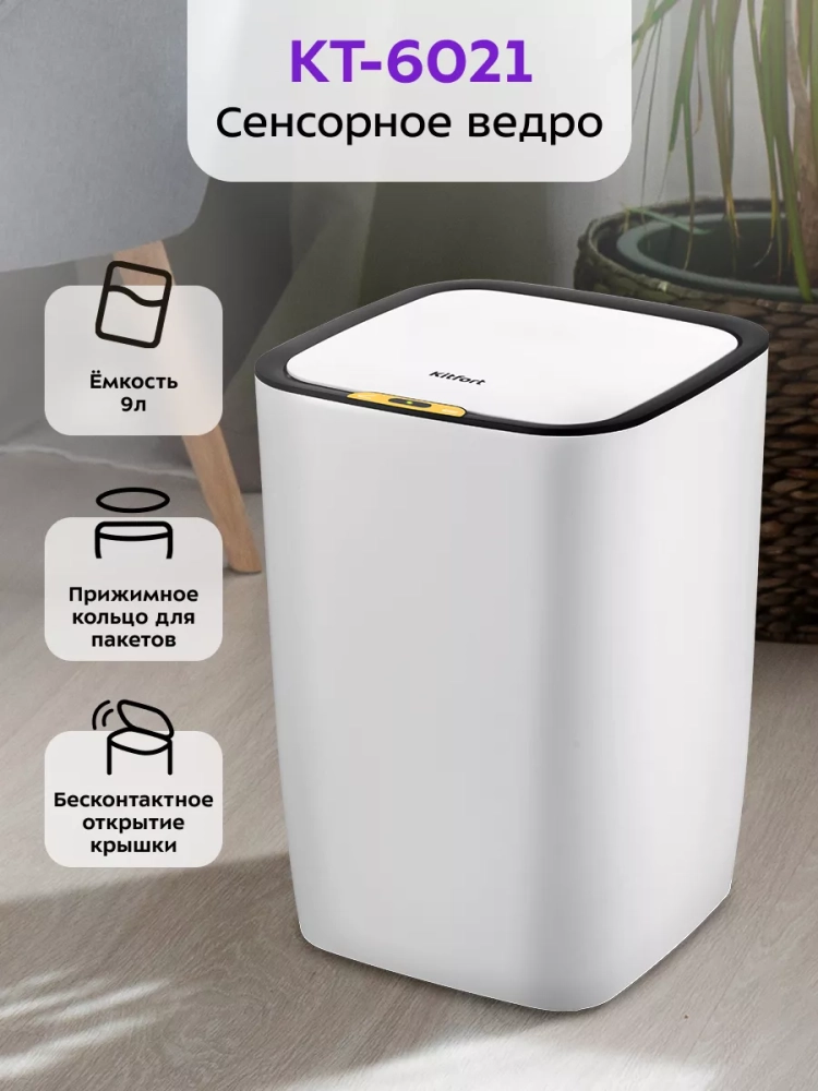 Сенсорное мусорное ведро оснащено инфракрасными датчиками. Такое ведро открывается и закрывается автоматически и его не нужно касаться при выбрасывании мусора. Датчики ведра КТ-6021 расположены на крышке сверху. Когда объект появляется в зоне действия датчиков — откидная крышка ведра автоматически открывается и закрывается через 5 секунд. Также эта модель оснащена сенсорными кнопками для открытия и закрытия крышки. Если откидная крышка была открыта нажатием на кнопку, она автоматически закроется через 1,5 минуты.