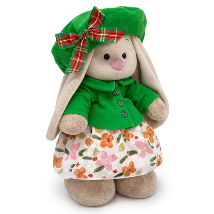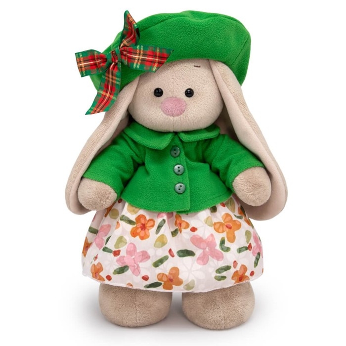 Милая мягкая игрушка «Зайка Ми» — это хороший подарок для ребёнка или кукольного коллекционера. Курточка и берет игрушки сшиты из мягкого флиса зелёного цвета, пышная юбочка с крупным рисунком собрана резинкой на талии. Берет украшен красивым бантом в клетку. Одежду с игрушки можно снять.