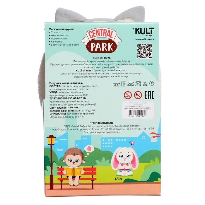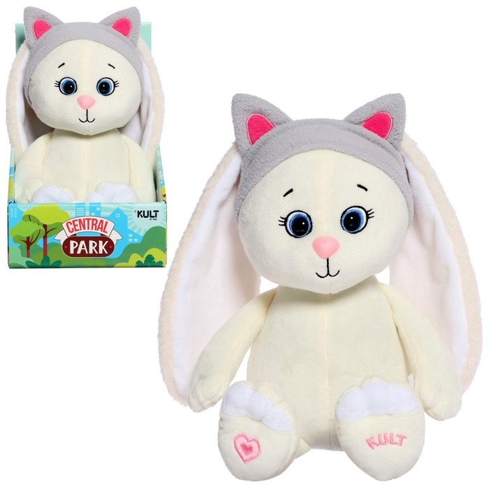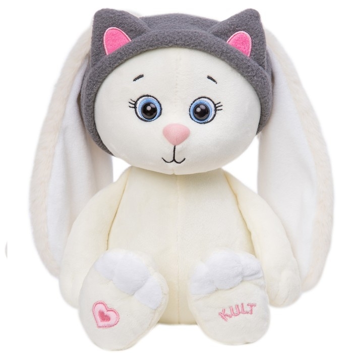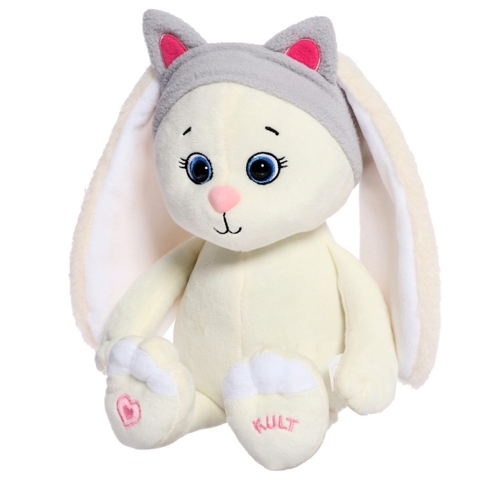 Зайка Мия очаровывает своим внешним видом. На голове игрушки милая повязка с кошачьими ушками, которую, при желании, можно снять. У игрушки мягкая шерсть, благодаря чему она подходит для объятий. На лапке игрушки вышито розовое сердечко.