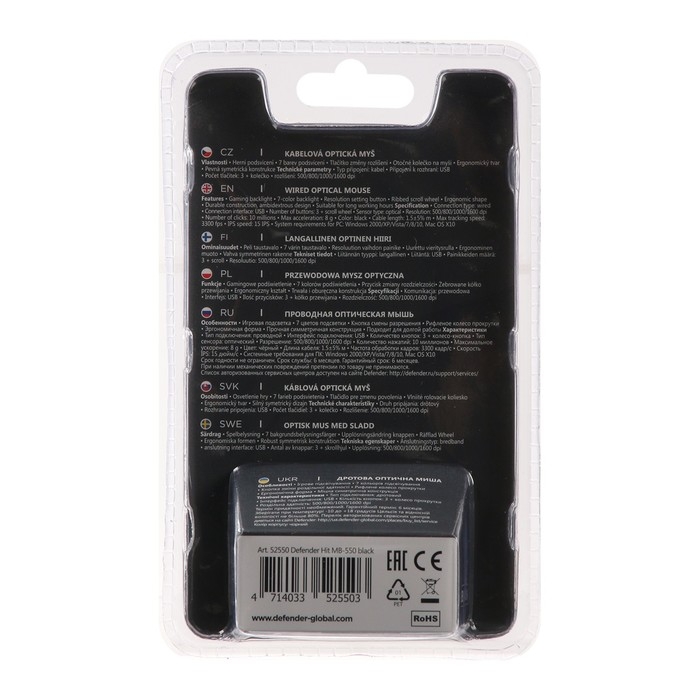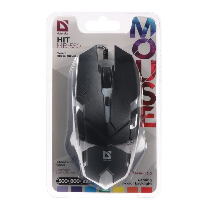 Мышь Defender Hit MB-550, проводная, оптическая, подсветка, 1600 dpi, 4 кнопки, черная