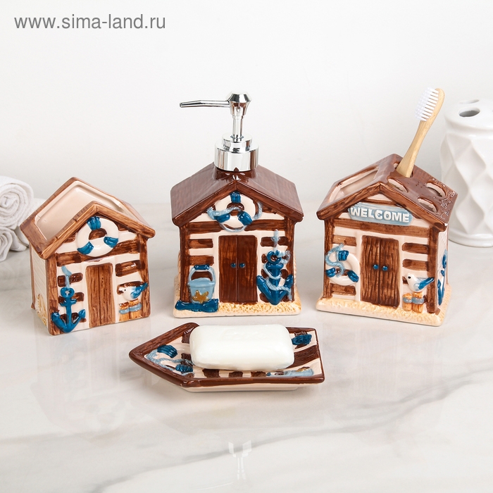 Набор аксессуаров для ванной комнаты Доляна «Маяк», 4 предмета (дозатор 400 мл, мыльница, 2 стакана), цвет коричневый