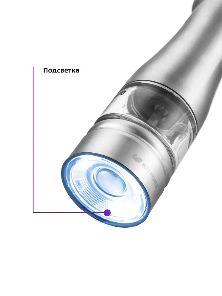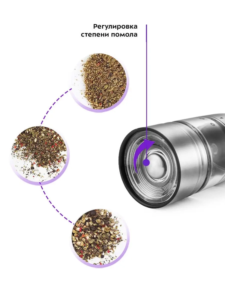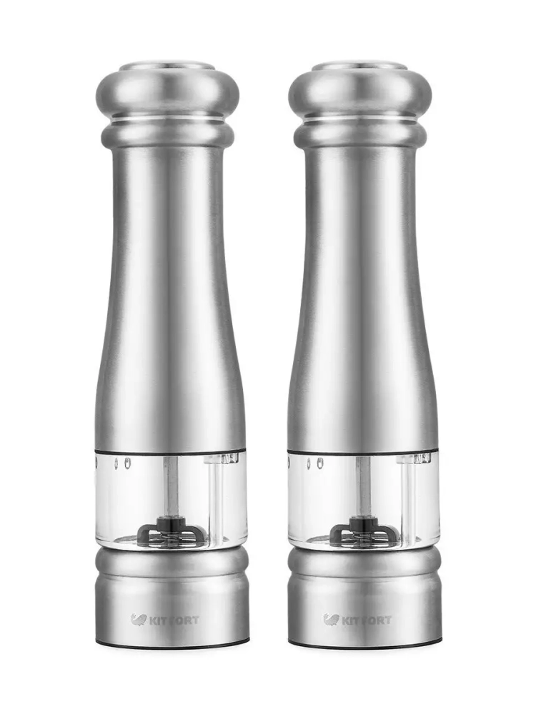 Электрическая мельница Kitfort KT-2030 измельчает перец-горошек, соль и другие специи. Установлены конические жернова из керамики, они долговечные, не стираются и не ржавеют. Мельница удобно лежит в руке, включается одной кнопкой и работает от 6 батареек типа ААА, которых хватает на долгое время. Нет нужды молоть специи впрок. Мельница одновременно мелет и дозирует. Поместите ее над блюдом и нажмите кнопку. Во время помола снизу загораются светодиоды, они освещают блюдо, чтобы вам было лучше видно количество специй. Поскольку чаще всего из специй используют соль и перец, мы положили в комплект две мельницы. Вы можете использовать набор мельниц как солонку и перечницу на столе, и у вас будет возможность посыпать готовые блюда свежемолотыми специями.