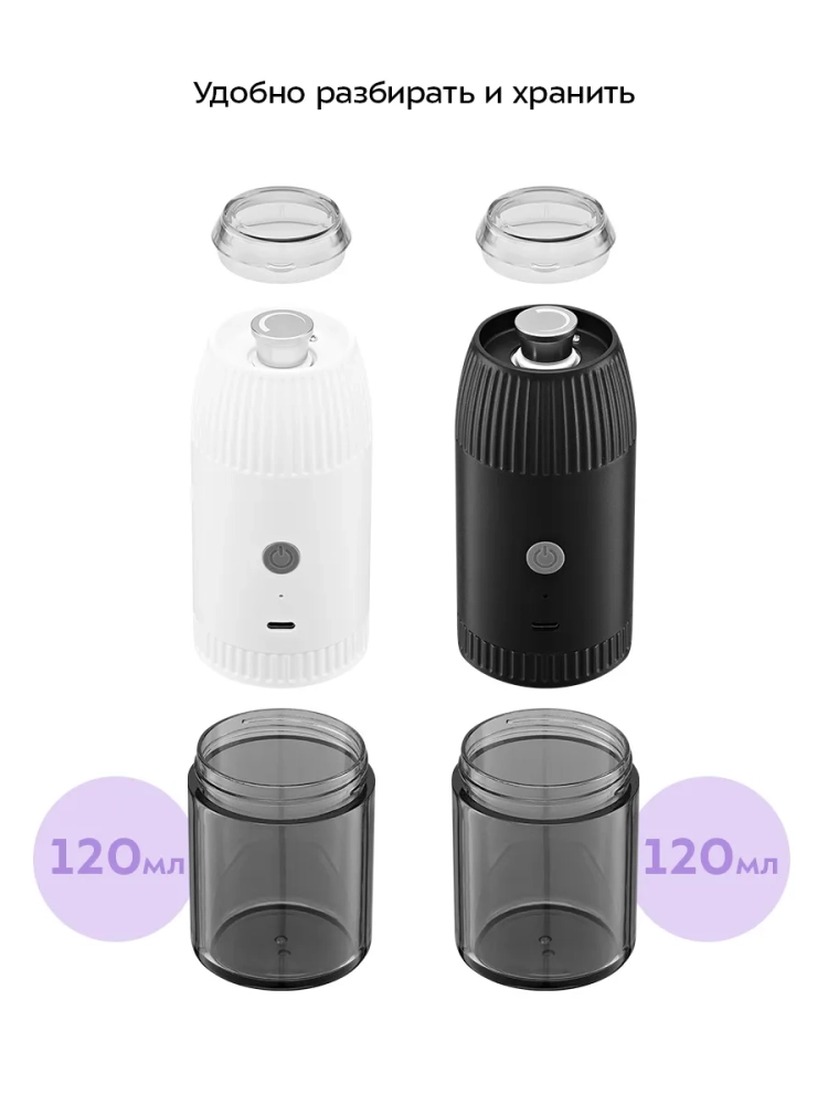 Степень помола специй регулируется винтом. Устройство имеет конические жернова из керамики. Они долговечные: не стираются и не ржавеют. Мельница удобно лежит в руке и работает от аккумулятора.