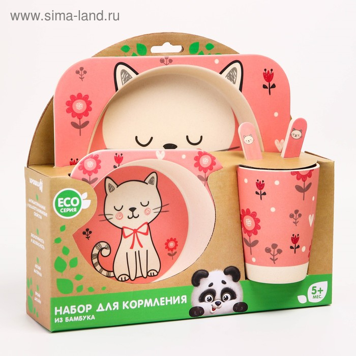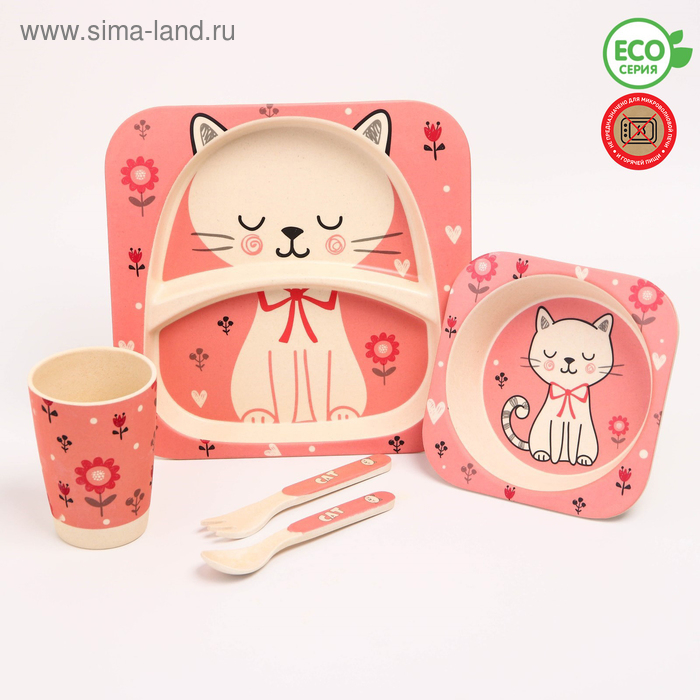 Набор детской бамбуковой посуды «Кошечка», тарелка, миска, стакан, приборы, 5 предметов